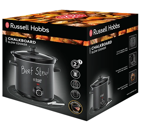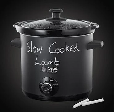 The Russell Hobbs Chalk Board Slow Cooker in stylish Matt Black is a cookpot with a twist. As well as providing all the advanced and clever features that make Russell Hobbs Slow Cookers indispensable, the Chalk Board housing means you can write on it too. Whether you want to leave little notes for the family telling them what’s for dinner or you want to keep track of a recipe – this creative concept will get everyone talking. Perfect for stews, roasts, chillies, soups and more If you’re cooking for up to four people, this family-sized, 3.5 litre cooker really can make your life easier. Not only can you come home to a tasty, nutritious pre-prepared meal, but you don’t have the hassle and mess that comes with using additional pans, grills or the oven. One compact pot does the lot. Considered to be an easier, healthier, more economical way to cook Slow cooked meat can make mealtimes tastier. The gentle cooking action reduces damage to vitamins and retains more of your food’s nutrients and flavours. It makes the most of your budget too because long, slow cooking can tenderise cheaper, tougher cuts of meat, and uses about a quarter of the power of the small ring on the average hob.