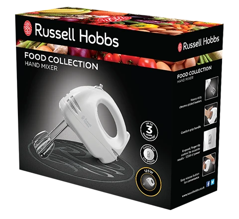Use the Russell Hobbs Food Collection Hand Mixer to mix egg whites, cake mixture and batter to optimum consistency. The Russell Hobbs Food Collection Hand Mixer comes in a solid white glossed body and features an easy release button for simple beater removal. The six speed settings mean that you can select the appropriate speed for the food type and create accurate results every time.