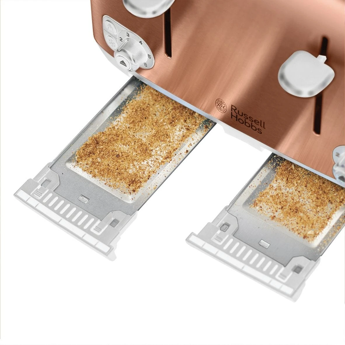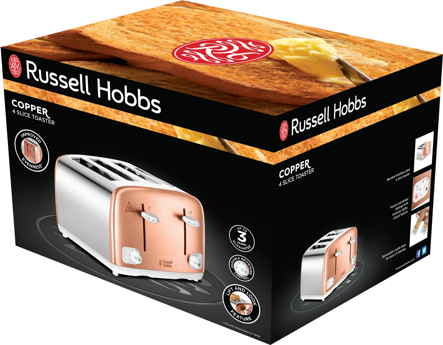 The Russell Hobbs Copper 4-slice Toaster with extra wide slots has a contemporary copper finish that will look stylish in a wide variety of kitchen designs. It’s not just beautiful to look at, it’s designed with technology to improve toasting evenness*, plus it has 6 browning settings so you can enjoy your toast just the way you like it making breakfast time even tastier.