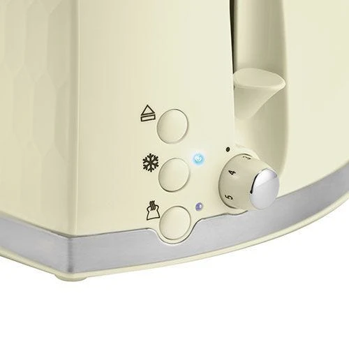 Keep your kitchen on-trend with the Honeycomb 2 Slice Toaster in a Premium Cream with a Textured Design. Letting you give your kitchen a makeover without blowing your budget, this toaster not only brings style to your countertop but it also comes convenient features too. Its High Lift Feature lets you lift your toast up to your fingertips so you can safely retrieve those smaller items, and the convenient Frozen, Cancel and Reheat functions mean you can take care of your every toasting need!