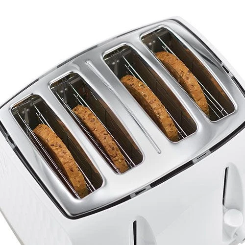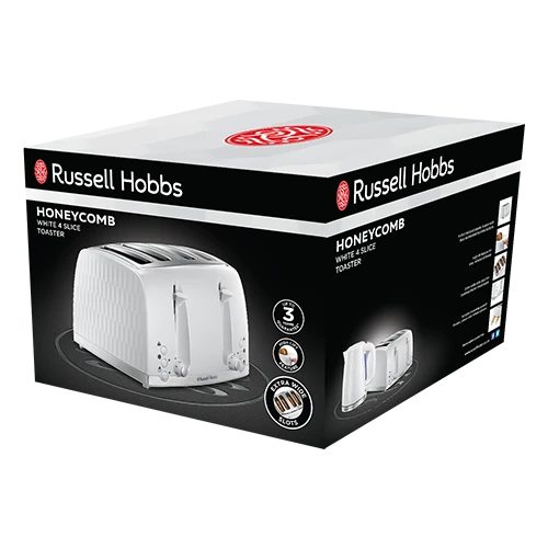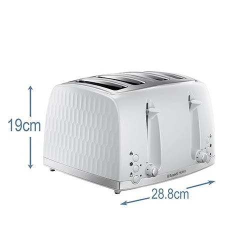 Keep up with the latest trends with the Honeycomb 4 Slice White Toaster. Bringing a little style to your breakfast routine, making over the kitchen has never been easier or more affordable. With a Textured Honeycomb-Inspired Design on a Premium White Plastic, you’ll want this toaster to take pride of place in your kitchen. Enjoy a crunchy slice of toast lifted up to your fingertips with the High Lift Feature, and take care of your every toasting need with the convenient Frozen, Cancel and Reheat functions. Giving you an exceptional performance without breaking the bank, this on-trend toaster lets you get the very best from your breakfast.
