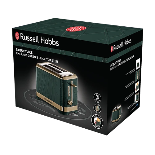 The Russell Hobbs Structure Brass Emerald Green Toaster is a stunning addition to my kitchen. The emerald green color and brass accents give it a vintage yet modern look. It toasts bread evenly and quickly, and the 2-slice capacity is perfect for my small household. The crumb tray is easy to remove and clean, which is a big plus. Overall, I’m very happy with this purchase!