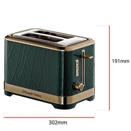 The Russell Hobbs Structure Brass Emerald Green Toaster is a stunning addition to my kitchen. The emerald green color and brass accents give it a vintage yet modern look. It toasts bread evenly and quickly, and the 2-slice capacity is perfect for my small household. The crumb tray is easy to remove and clean, which is a big plus. Highly recommend for anyone looking for a stylish and functional toaster!
